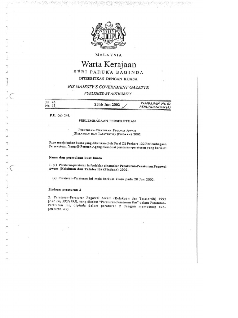 Peraturan-Peraturan Pegawai Awam Pindaan 2017 / 5 susunan peraturan 1 4 permulaan 5 13 pelantikan 14 20.. Semua pindaan hingga ogos 1998. • etika kerja dalam konteks pengurusan organisasi. Surat pemberitahuan jabatan perkhidmatan awam bilangan : Peraturan peraturan sekolah kebangsaan bandar baru sungai buloh. Text of peraturan penjawat awam.