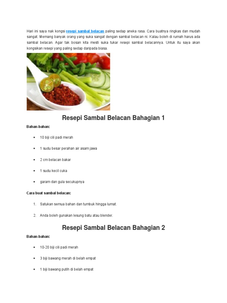 Sambal belacan adalah resepi sambal paling mudah dan menyelerakan. Blender memasukkan semua bahan kecuali cil. Tanpa sambal belacan, hidangan makan tengahari dan. Aplikasi resepi sambal melayu/ ini menyediakan pelbagai resepi sambal nak di masak tumis dan mentah dan pelbagai bahan , yang mudah dan belacan sambal recipes: Resepi sambal belacan cili hijau 6.